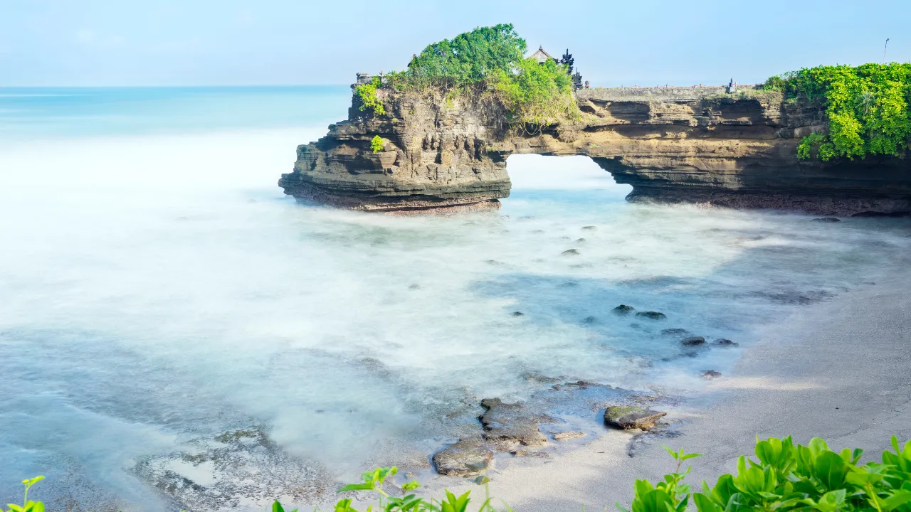 Just a short walk from Tanah Lot lies Batu Bolong Temple, another coastal gem that offers both natural charm and spiritual value. Built on a rocky cliff with a striking natural archway carved by the ocean, the temple provides sweeping views of the sea. The peaceful ambiance makes it an ideal spot for quiet reflection and photography. During sunset, the scenery becomes even more magical, making Batu Bolong a perfect complement to a visit to Tanah Lot.