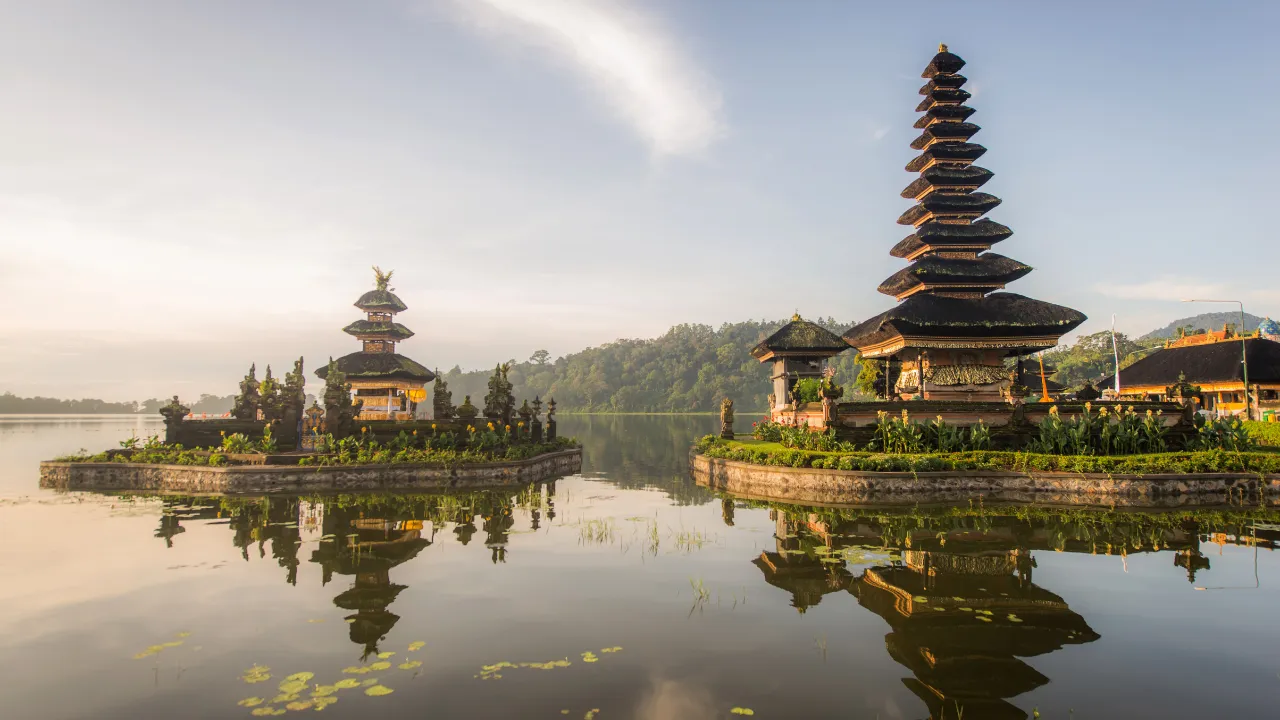 A serene mountain lake famous for Ulun Danu Beratan Temple, beautifully floating on the water with misty highland scenery.